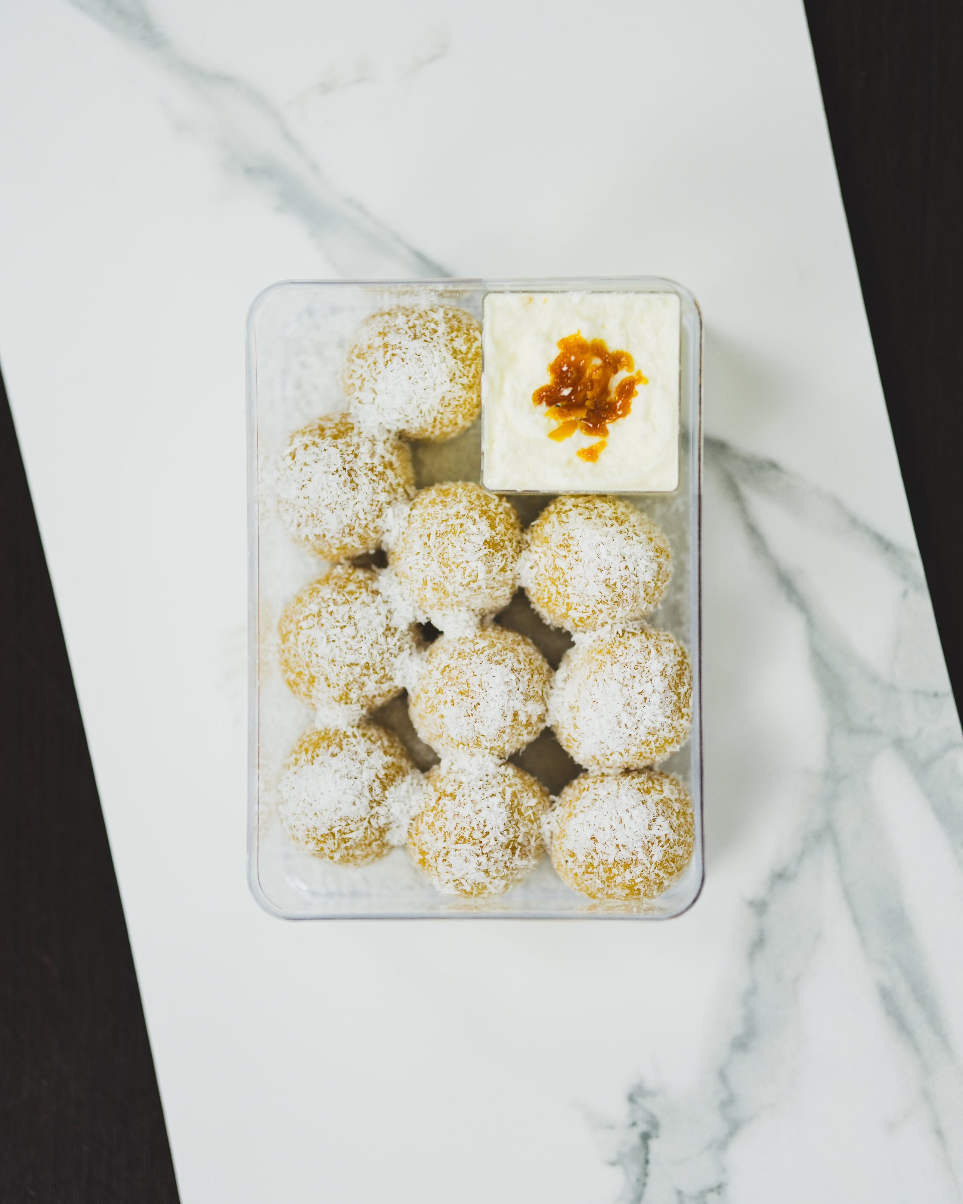 Shop NowTiramisu truffles infused with pandan juice and rum, finished with a delicate coating of coconut flakes.